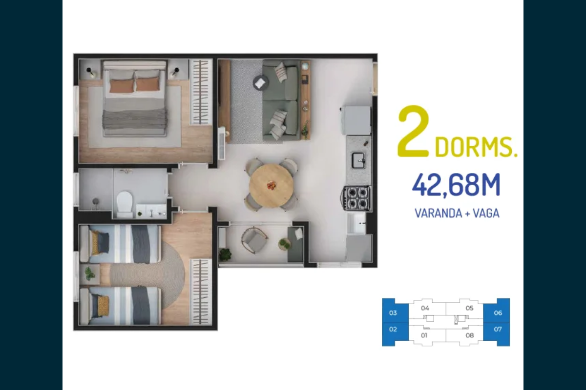 O projeto foi concebido para proporcionar uma experiência de moradia moderna e funcional, com unidades residenciais de 1 e 2 dormitórios, ideais tanto para quem busca a sua primeira casa própria quanto para quem deseja investir em um imóvel com potencial de valorização contínua.